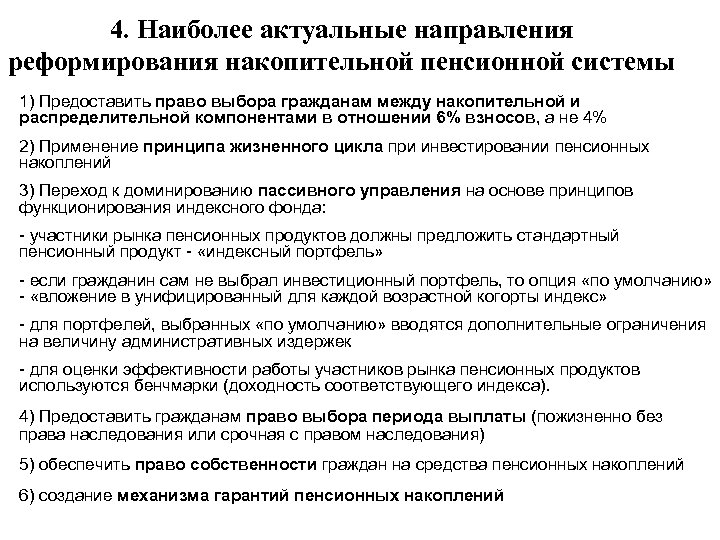 4. Наиболее актуальные направления реформирования накопительной пенсионной системы 1) Предоставить право выбора гражданам между накопительной и распределительной компонентами в отношении 6% взносов, а не 4% 2) Применение принципа жизненного цикла при инвестировании пенсионных накоплений 3) Переход к доминированию пассивного управления на основе принципов функционирования индексного фонда: - участники рынка пенсионных продуктов должны предложить стандартный пенсионный продукт - «индексный портфель» - если гражданин сам не выбрал инвестиционный портфель, то опция «по умолчанию» - «вложение в унифицированный для каждой возрастной когорты индекс» - для портфелей, выбранных «по умолчанию» вводятся дополнительные ограничения на величину административных издержек - для оценки эффективности работы участников рынка пенсионных продуктов используются бенчмарки (доходность соответствующего индекса). 4) Предоставить гражданам право выбора периода выплаты (пожизненно без права наследования или срочная с правом наследования) 5) обеспечить право собственности граждан на средства пенсионных накоплений 6) создание механизма гарантий пенсионных накоплений