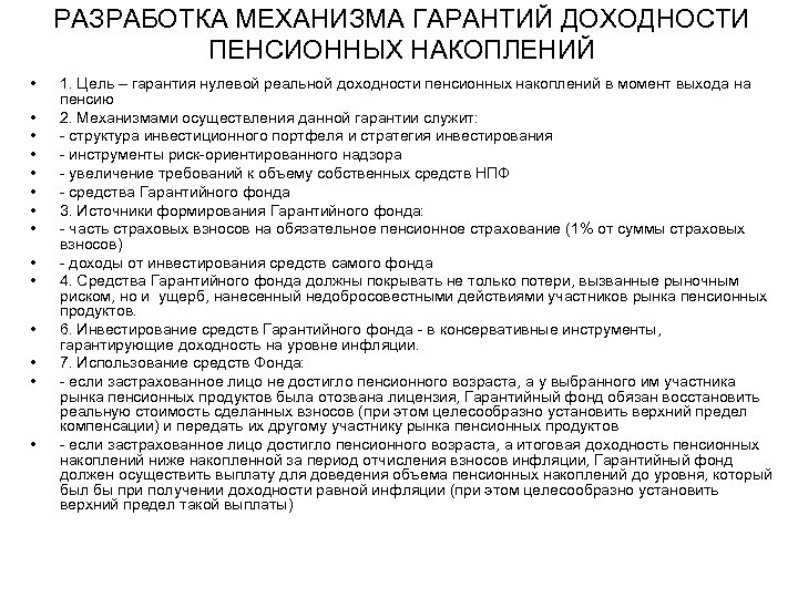РАЗРАБОТКА МЕХАНИЗМА ГАРАНТИЙ ДОХОДНОСТИ ПЕНСИОННЫХ НАКОПЛЕНИЙ • • • • 1. Цель – гарантия нулевой реальной доходности пенсионных накоплений в момент выхода на пенсию 2. Механизмами осуществления данной гарантии служит: - структура инвестиционного портфеля и стратегия инвестирования - инструменты риск-ориентированного надзора - увеличение требований к объему собственных средств НПФ - средства Гарантийного фонда 3. Источники формирования Гарантийного фонда: - часть страховых взносов на обязательное пенсионное страхование (1% от суммы страховых взносов) - доходы от инвестирования средств самого фонда 4. Средства Гарантийного фонда должны покрывать не только потери, вызванные рыночным риском, но и ущерб, нанесенный недобросовестными действиями участников рынка пенсионных продуктов. 6. Инвестирование средств Гарантийного фонда - в консервативные инструменты, гарантирующие доходность на уровне инфляции. 7. Использование средств Фонда: - если застрахованное лицо не достигло пенсионного возраста, а у выбранного им участника рынка пенсионных продуктов была отозвана лицензия, Гарантийный фонд обязан восстановить реальную стоимость сделанных взносов (при этом целесообразно установить верхний предел компенсации) и передать их другому участнику рынка пенсионных продуктов - если застрахованное лицо достигло пенсионного возраста, а итоговая доходность пенсионных накоплений ниже накопленной за период отчисления взносов инфляции, Гарантийный фонд должен осуществить выплату для доведения объема пенсионных накоплений до уровня, который был бы при получении доходности равной инфляции (при этом целесообразно установить верхний предел такой выплаты)