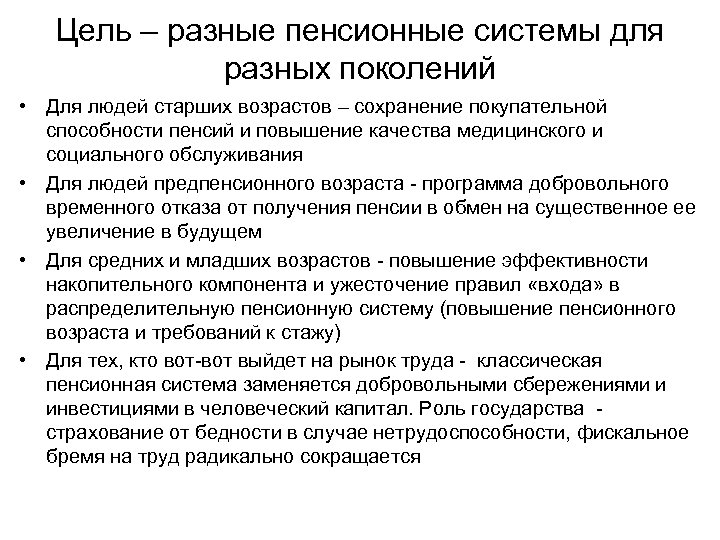 Цель – разные пенсионные системы для разных поколений • Для людей старших возрастов – сохранение покупательной способности пенсий и повышение качества медицинского и социального обслуживания • Для людей предпенсионного возраста - программа добровольного временного отказа от получения пенсии в обмен на существенное ее увеличение в будущем • Для средних и младших возрастов - повышение эффективности накопительного компонента и ужесточение правил «входа» в распределительную пенсионную систему (повышение пенсионного возраста и требований к стажу) • Для тех, кто вот-вот выйдет на рынок труда - классическая пенсионная система заменяется добровольными сбережениями и инвестициями в человеческий капитал. Роль государства страхование от бедности в случае нетрудоспособности, фискальное бремя на труд радикально сокращается