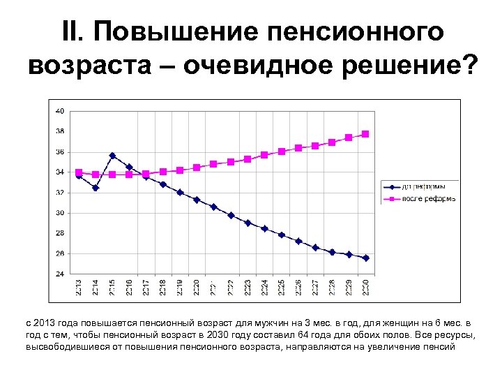II. Повышение пенсионного возраста – очевидное решение? с 2013 года повышается пенсионный возраст для мужчин на 3 мес. в год, для женщин на 6 мес. в год с тем, чтобы пенсионный возраст в 2030 году составил 64 года для обоих полов. Все ресурсы, высвободившиеся от повышения пенсионного возраста, направляются на увеличение пенсий