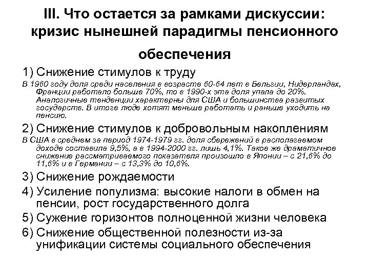 III. Что остается за рамками дискуссии: кризис нынешней парадигмы пенсионного обеспечения 1) Снижение стимулов к труду В 1960 году доля среди населения в возрасте 60 -64 лет в Бельгии, Нидерландах, Франции работало больше 70%, то в 1990 -х эта доля упала до 20%. Аналогичные тенденции характерны для США и большинства развитых государств. В итоге люде хотят меньше работать и раньше уходить на пенсию. 2) Снижение стимулов к добровольным накоплениям В США в среднем за период 1974 -1979 гг. доля сбережений в располагаемом доходе составила 9, 5%, а в 1994 -2000 гг. лишь 4, 1%. Такое же драматичное снижение рассматриваемого показателя произошло в Японии – с 21, 6% до 11, 6% и в Германии – с 13, 3% до 10, 6%. 3) Снижение рождаемости 4) Усиление популизма: высокие налоги в обмен на пенсии, рост государственного долга 5) Сужение горизонтов полноценной жизни человека 6) Снижение общественной полезности из-за унификации системы социального обеспечения