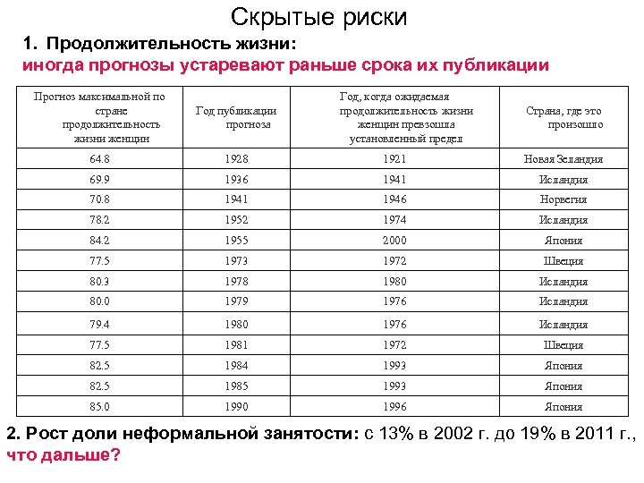 Скрытые риски 1. Продолжительность жизни: иногда прогнозы устаревают раньше срока их публикации Прогноз максимальной по стране продолжительность жизни женщин Год публикации прогноза Год, когда ожидаемая продолжительность жизни женщин превзошла установленный предел 64. 8 1921 Новая Зеландия 69. 9 1936 1941 Исландия 70. 8 1941 1946 Норвегия 78. 2 1952 1974 Исландия 84. 2 1955 2000 Япония 77. 5 1973 1972 Швеция 80. 3 1978 1980 Исландия 80. 0 1979 1976 Исландия 79. 4 1980 1976 Исландия 77. 5 1981 1972 Швеция 82. 5 1984 1993 Япония 82. 5 1985 1993 Япония 85. 0 1996 Япония Страна, где это произошло 2. Рост доли неформальной занятости: с 13% в 2002 г. до 19% в 2011 г. , что дальше?