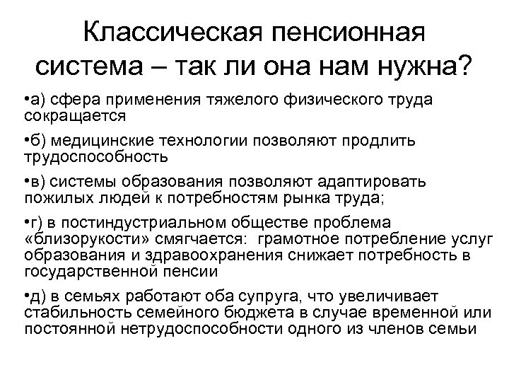 Классическая пенсионная система – так ли она нам нужна? • а) сфера применения тяжелого физического труда сокращается • б) медицинские технологии позволяют продлить трудоспособность • в) системы образования позволяют адаптировать пожилых людей к потребностям рынка труда; • г) в постиндустриальном обществе проблема «близорукости» смягчается: грамотное потребление услуг образования и здравоохранения снижает потребность в государственной пенсии • д) в семьях работают оба супруга, что увеличивает стабильность семейного бюджета в случае временной или постоянной нетрудоспособности одного из членов семьи