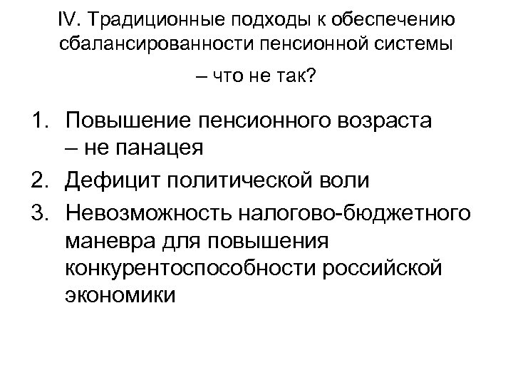 IV. Традиционные подходы к обеспечению сбалансированности пенсионной системы – что не так? 1. Повышение пенсионного возраста – не панацея 2. Дефицит политической воли 3. Невозможность налогово-бюджетного маневра для повышения конкурентоспособности российской экономики