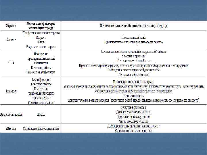 ЗАРУБЕЖНЫЙ ОПЫТ МОТИВАЦИИ ТРУДА Японская модель n Характеризуется опережением роста производительности труда по отношению к росту уровня жизни населения, в том числе уровня заработной платы. С целью поощрения предпринимательской активности государством не принимается серьезных мер по контролю за имущественным расслоением общества.