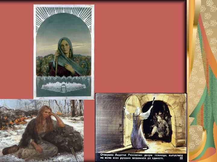 Авдотья Рязаночка в славянских былинах мудрая героиня, справляющаяся с врагами хитростью и смекалкой. Войско хана Батыя разорило Рязань. По преданию, из всех горожан уцелела только одна семья – семья Авдотьи. Эта женщина не побоялась отправиться за своими близкими в Золотую Орду. В одиночку она пошла пешком за две с половиной тысячи километров – в Золотую Орду, чтобы выручить из плена своих родных. Только следующей осенью Авдотья достигла ханской ставки. Рязаночку провели к хану в шатер. Услышав ее просьбу освободить родных, хан расхохотался. Он сказал, что пленных у него много и не будет он среди них искать родственников Авдотьи. Только из уважения к ее храбрости хан предложил ей сорвать любой цветок, растущий перед шатром, и искать своих близких, пока цветок не завянет в руке Авдотьи. Если завянет – ее ждет казнь.