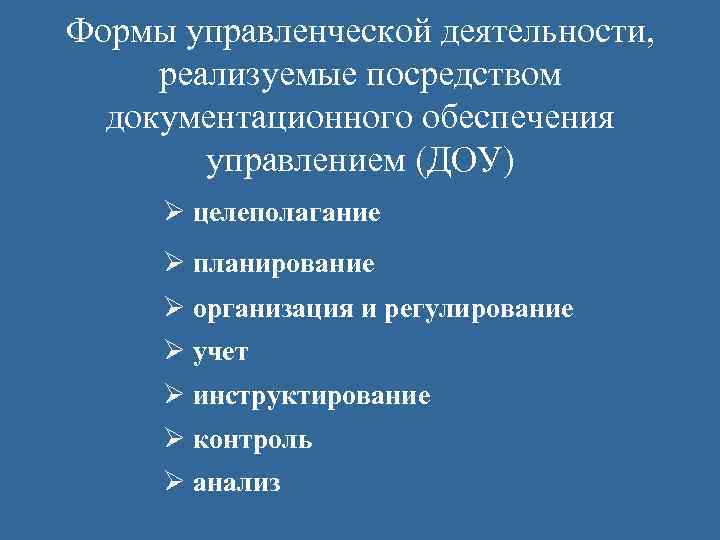Формы управленческой деятельности, реализуемые посредством документационного обеспечения управлением (ДОУ) Ø целеполагание Ø планирование Ø организация и регулирование Ø учет Ø инструктирование Ø контроль Ø анализ