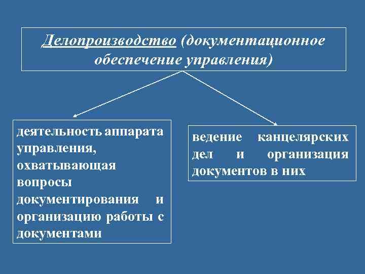 Делопроизводство (документационное обеспечение управления) деятельность аппарата управления, охватывающая вопросы документирования и организацию работы с документами ведение канцелярских дел и организация документов в них