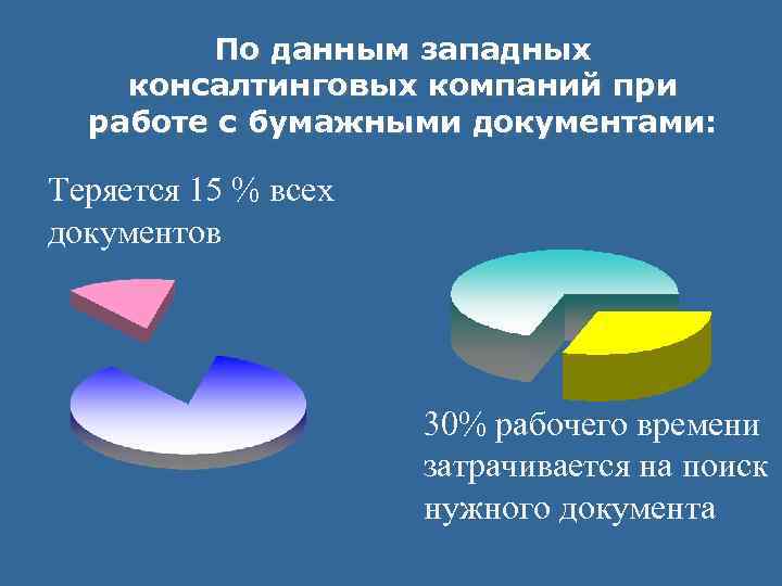 По данным западных консалтинговых компаний при работе с бумажными документами: Теряется 15 % всех документов 30% рабочего времени затрачивается на поиск нужного документа