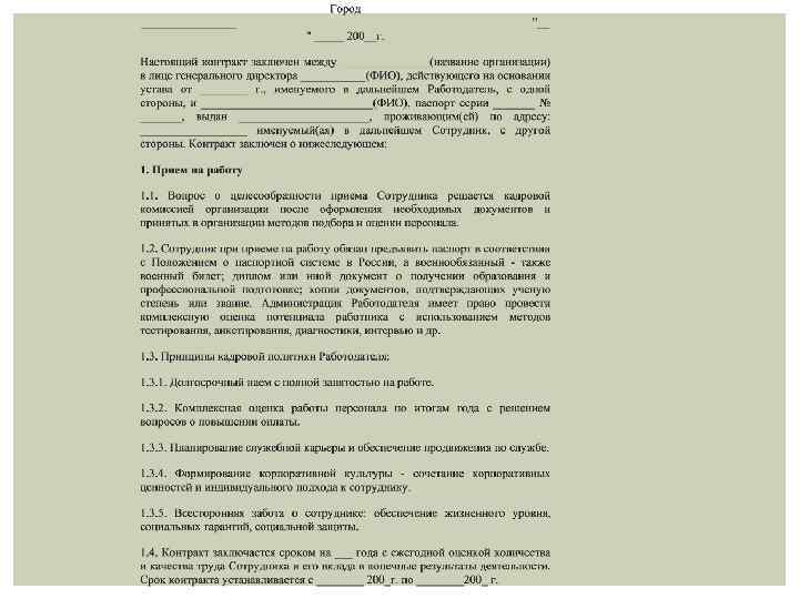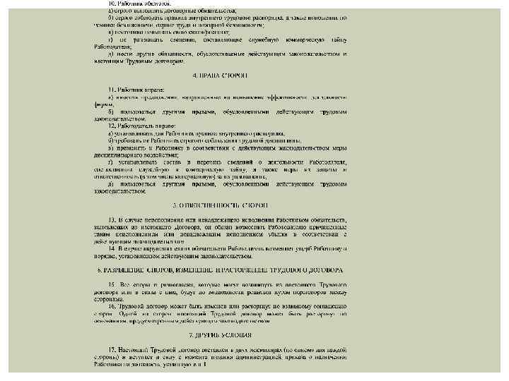 Основные условия договора включают соглашения: 1) о работе по одной или нескольким специальностям; 2) квалификации; 3) месте работы; 4) сроке действия; 5) виде трудового договора; 6) об условиях оплаты труда.