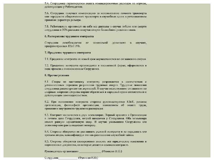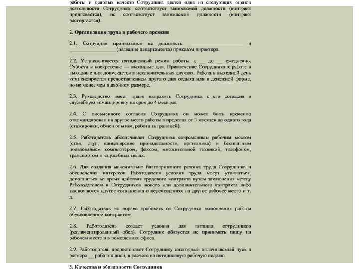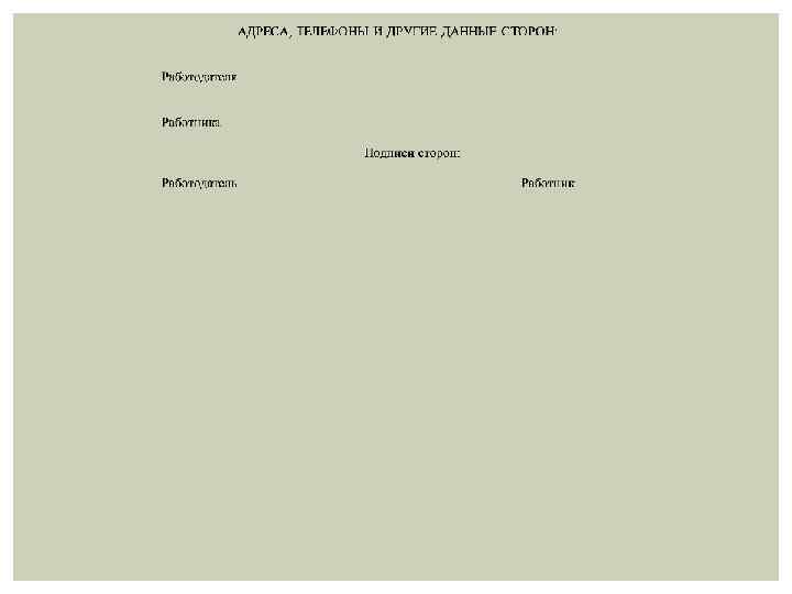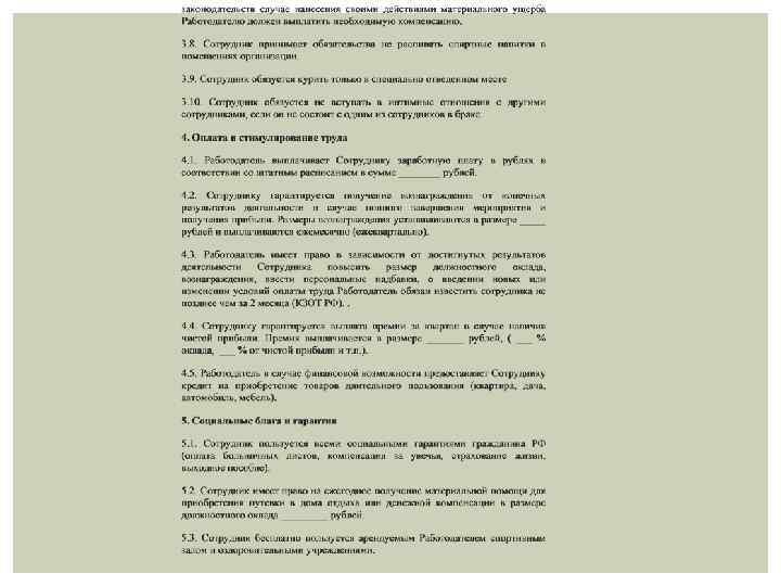 Основные условия, которые рекомендуется указывать в договорах: 1) место работы; 2) конкретная работа по профессии, должности; 3) дата начала работы и ее окончания; 4) оплата труда; 5) обязанности предприятия по охране труда.