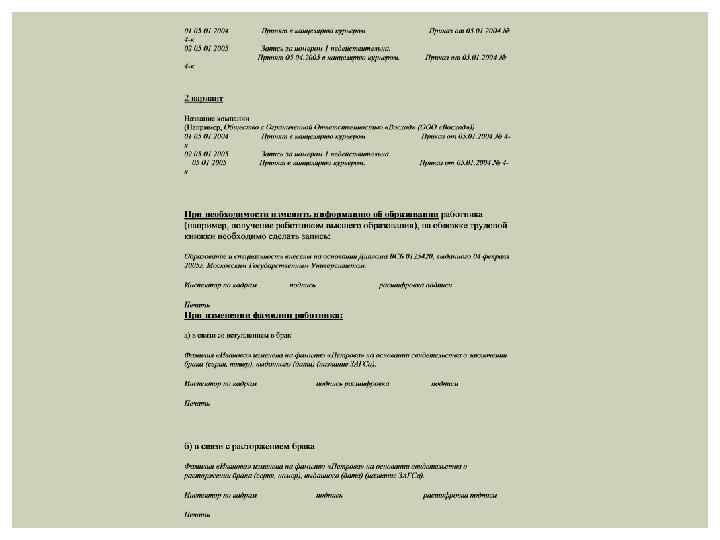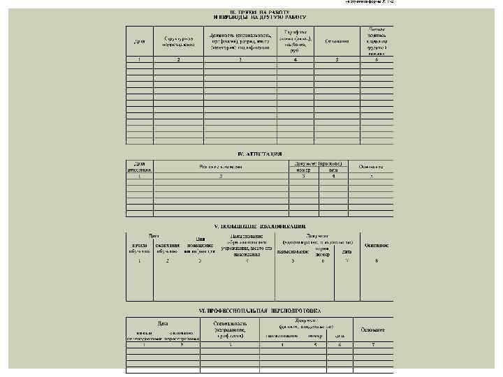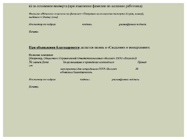 В трудовые книжки вносятся следующие данные: 1) сведения о работнике; 2) сведения о работе; 3) сведения о награждениях и поощрениях. (Форма представления о поощрении дана в приложении 9); 4) сведения об открытиях, на которые выданы дипломы; 5) взыскания в трудовую книжку не вносятся.