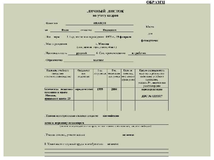 11. ЛИЧНЫЙ ЛИСТОК ПО УЧЕТУ КАДРОВ Личный листок по учету кадров - перечень вопросов о биографических данных работника, образовании, трудовой деятельности, семейном положении и т. п.