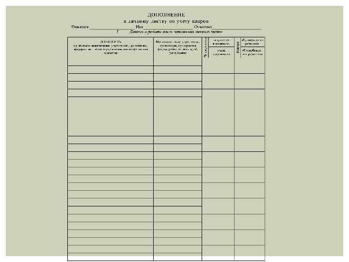13. ДОПОЛНЕНИЕ К ЛИЧНОМУ ЛИСТКУ ПО УЧЕТУ КАДРОВ Дополнение к личному листку по учету кадров - документ, в котором отмечаются сведения об изменениях, касающихся работника после заполнения личного листка.