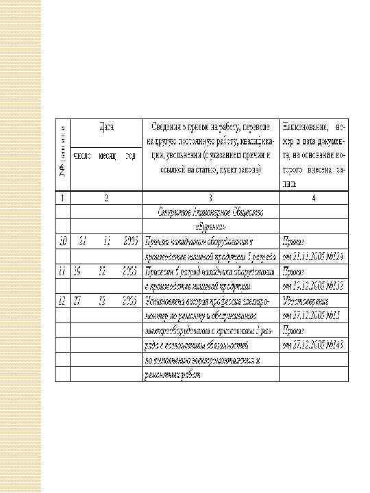 Трудовая книжка Основной документ, подтверждающий стаж работы. Трудовые книжки ведутся на всех работников, проработавших свыше 5 дней. Законом запрещается иметь несколько трудовых книжек. Лица, поступающие на работу, обязаны предъявить администрации предприятия трудовую книжку, сдать её в отдел кадров. Поступающие на работу впервые, представляют документ о последнем занятии, уволенные из рядов ВС - военный билет.