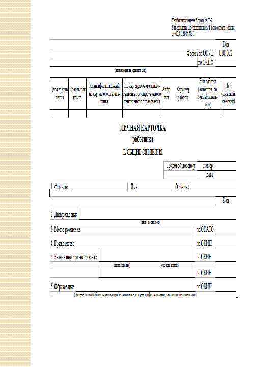 ЛИЧНЫЕ КАРТОЧКИ Основным документом по учету персонала предприятия является личная карточка формы Т-2, которая заводится на всех работников предприятия, принятых на постоянную или временную работу.