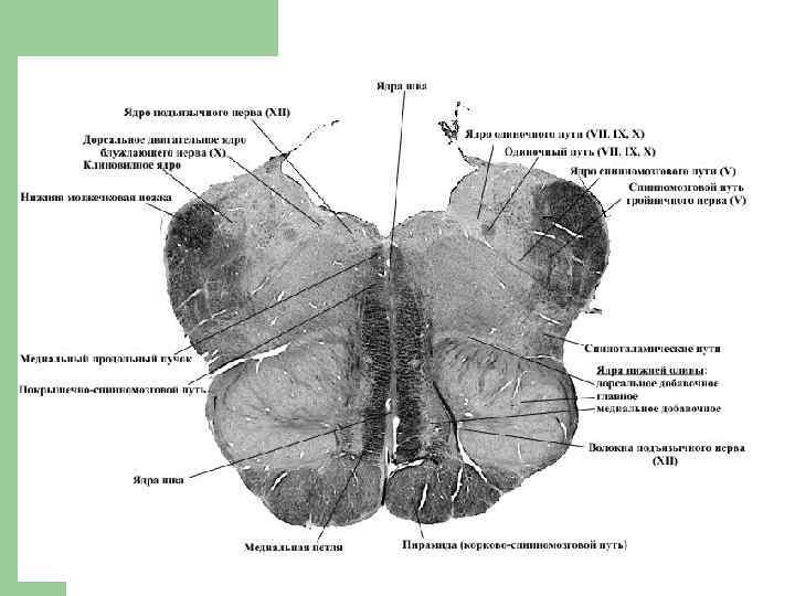 Продолговатый мозг построен из белого и серого вещества. l Серое вещество продолговатого мозга представлено ядрами IX, X, XII пар черепных нервов, ядрами олив, ретикулярной формации, центрами дыхания и кровообращения.