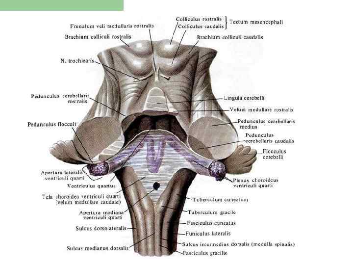 Анатомические структуры заднего мозга, вид сзади Срединная борозда Медиальное возвышение Лицевой бугорок Мозговые полоски Средние ножки мозжечка