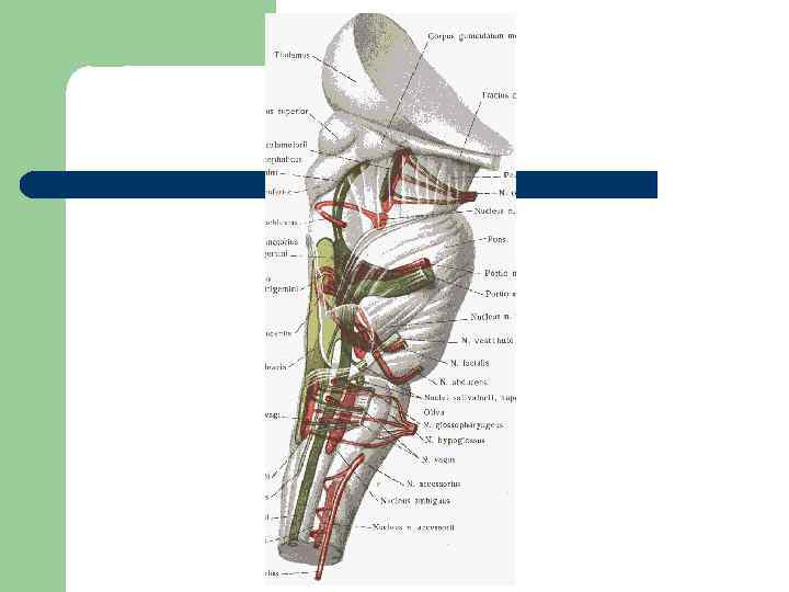 Ядра ЧМН (V-XII), залегающие в дне РЯ l Блуждающий нерв, вагус (Х): три ядра: двигательное двойное (общее с IX парой) и чувствительное, а также парасимпатическое заднее ядро блуждающего нерва. l Добавочный нерв (ХI) и подъязычный нерв (ХII) имеют только по одному двигательному ядру.