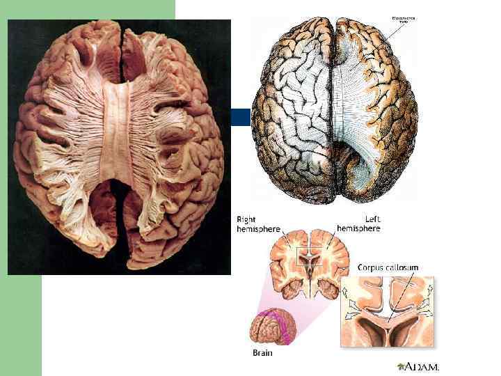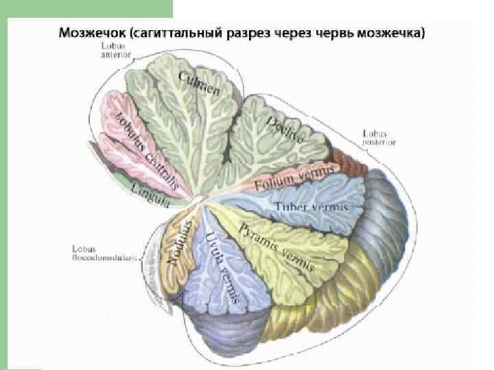 Внутреннее строение мозжечка Белое вещество мозжечка представлено: l Афферентными и l Эфферентными волокнами, которые связывают мозжечок с другими отделами мозга. Они образуют три пары мозжечковых ножек. Нижние ножки соединяют мозжечок с продолговатым мозгом Средние ножки - с мостом, Верхние ножки - с четверохолмием среднего мозга.