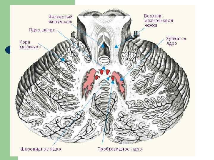 Внутреннее строение мозжечка На разрезе мозжечок состоит из серого и белого вещества Серое вещество: l Мозжечковые ядра. Находятся внутри мозжечка в толще белого вещества. 1. 2. 3. 4. Ближе всего к срединной линии мозжечка располагается ядро шатра. Латеральнее его находится шаровидное ядро. Ещё латеральнее находится пробковидное ядро. Самое крупное и самое латеральное ядро мозжечка, зубчатое ядро расположено в пределах полушария мозжечка.