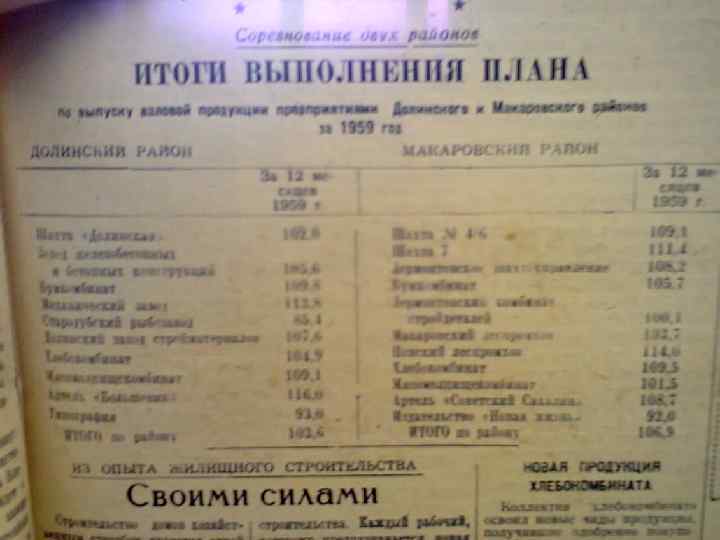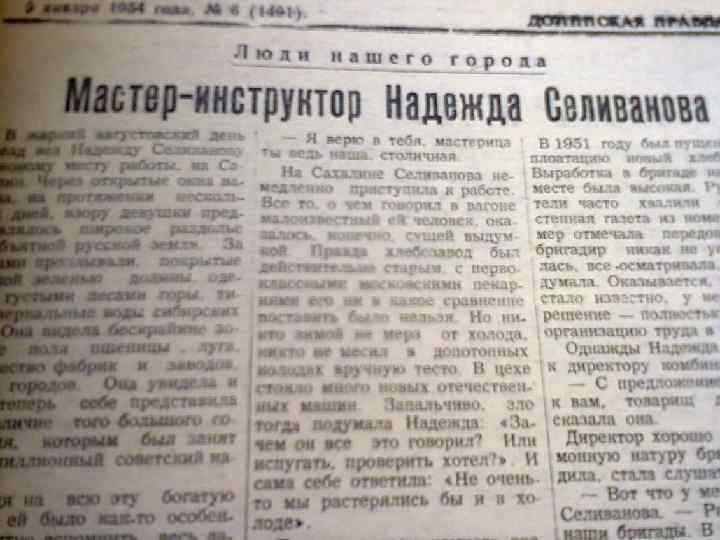 1954 год. 3 января Цена – 15 копеек Периодичность каждый день, кроме четверга Количество полос – 4 Формат А 3 Тираж 4000 экз. Адрес редакции: Г. Долинск. Ул. Ленина 5 Зам. Редактора Г. Чернобай Типография «Долинская правда»