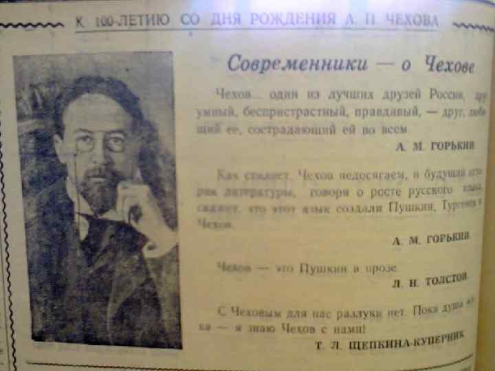 О великих людях газета не забывала к 100 летию А. П. Чехова выходит заметка с цитатами его современников.