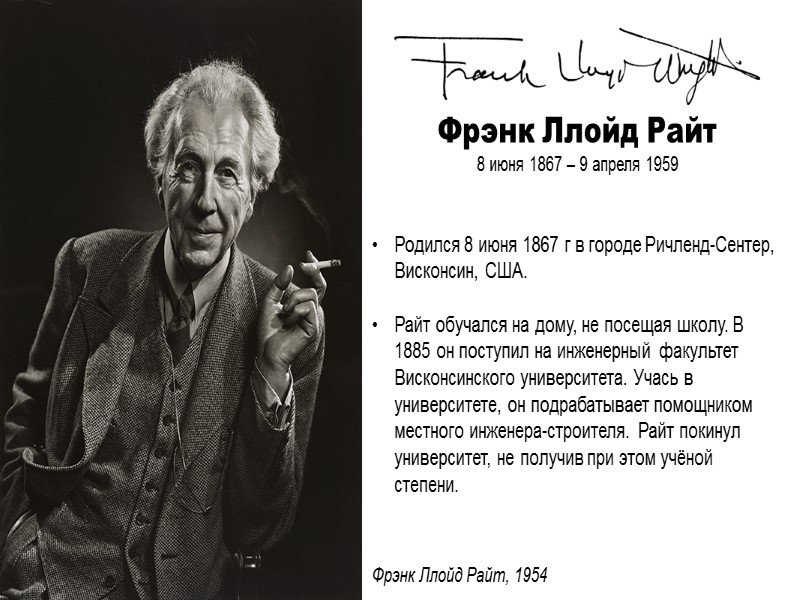Фрэнк Ллойд Райт, 1954 Фрэнк Ллойд Райт 8 июня 1867 – 9 апреля 1959 Родился 8 июня 1867 г в городе Ричленд-Сентер, Висконсин, США. Райт обучался на дому, не посещая школу. В 1885 он поступил на инженерный факультет Висконсинского университета. Учась в университете, он подрабатывает помощником местного инженера-строителя. Райт покинул университет, не получив при этом учёной степени.