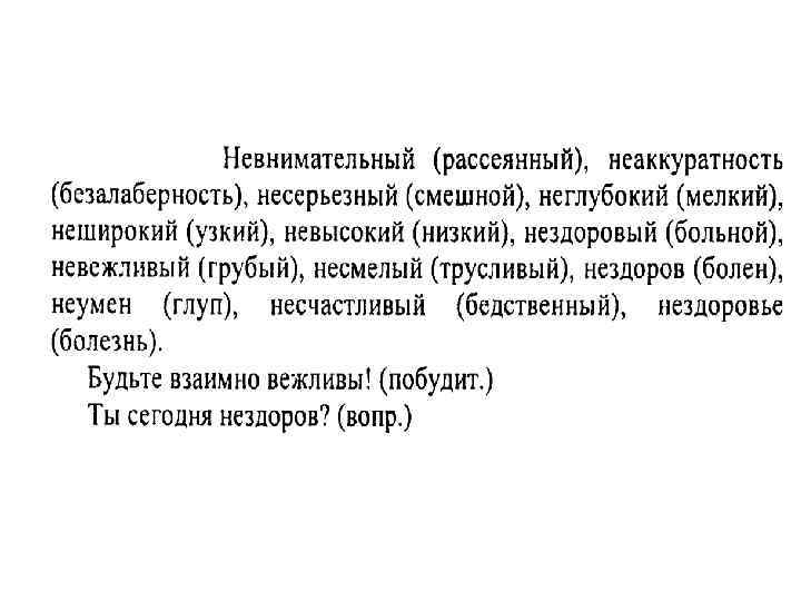 Заменить прилагательные синонимами с НЕ: • рассеянный ученик (невнимательный) • молчаливый человек (неразговорчивый) • плохая погода (ненастная) • грубый мальчик (невоспитанный, невежественный)
