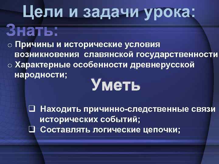 Цели и задачи урока: Знать: o Причины и исторические условия возникновения славянской государственности; o Характерные особенности древнерусской народности; Уметь q Находить причинно-следственные связи исторических событий; q Составлять логические цепочки;