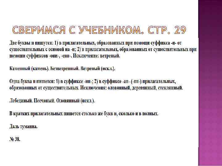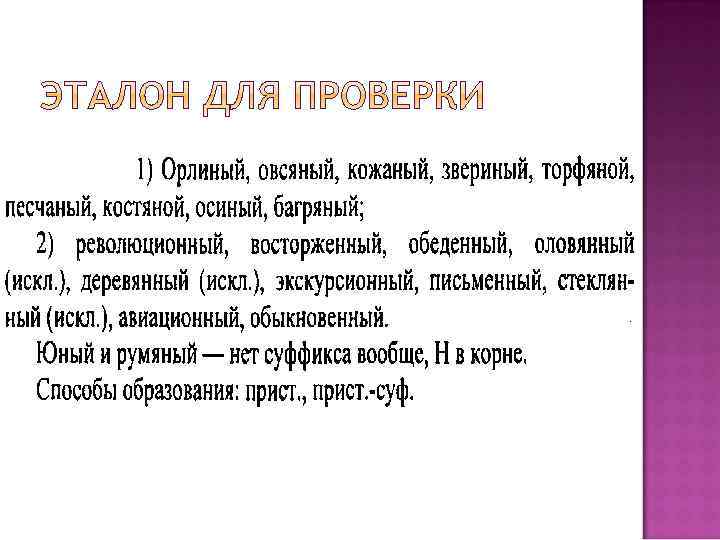 Н -ан-, -янкожаный ледяной Исключения: оловянный стеклянный деревянный -ингусиный куриный В прилагательных, не имеющих суффикса: юный, зеленый