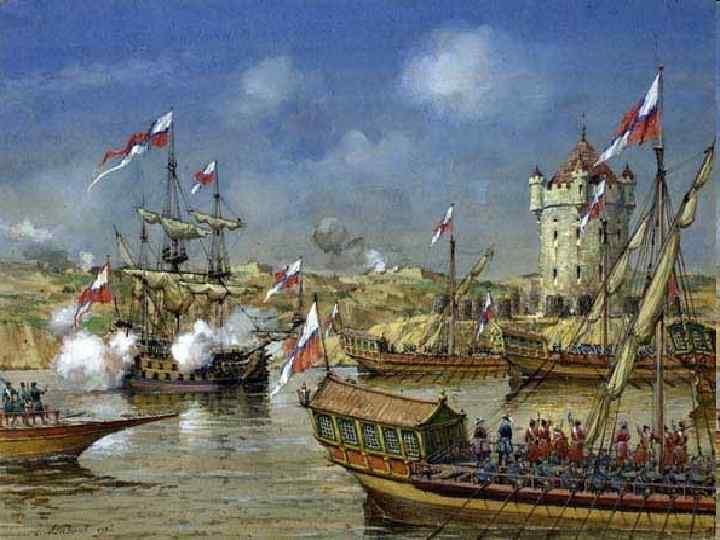 4. Азовские походы Днем и ночью 12 тыс. человек возводили земляной вал с тем, чтобы поднять его выше крепостных стен. Осажденные попытались помешать осуществлению этого плана Гордона, но их отбили Город окружили со всех сторон. На Дону действовала русская флотилия - сначала казаки на небольших судах уничтожили турецкие корабли, разгружавшиеся у стен крепости, потом русская эскадра вышла в море, где на рейде располагались тяжелые турецкие корабли с пехотой, запасами продовольствия, снаряжением, и не позволила войти им в устье Дона, пройти к осажденной крепости Турецкий гарнизон Азова, видя безнадежность положения, капитулировал. Город стал опорным пунктом России на южных рубежах, базой для армии Петра. Азовская кампания на практике продемонстрировала важность артиллерии и флота для ведения войны 2/18/2018
