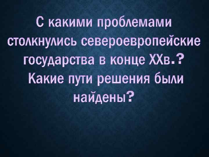 1. Мировой экономический кризис; 2. Снижение объёмов производства; 3. Сокращение социальных программ(снижение уровня жизни, безработица); Пути решения: 1. Норвежской экономике преодолеть энергетический кризис помогло открытие больших запасов нефти в Северном море. 2. Финляндия смогла поддержать свою экономику в хорошем состоянии благодаря активным торговым связям с СССР. В 1972 г Дания вступила в ЕС. В 1995 г. Финляндия и Швеция стали членами ЕС. Исландия ведёт переговоры о вступлении в ЕС.
