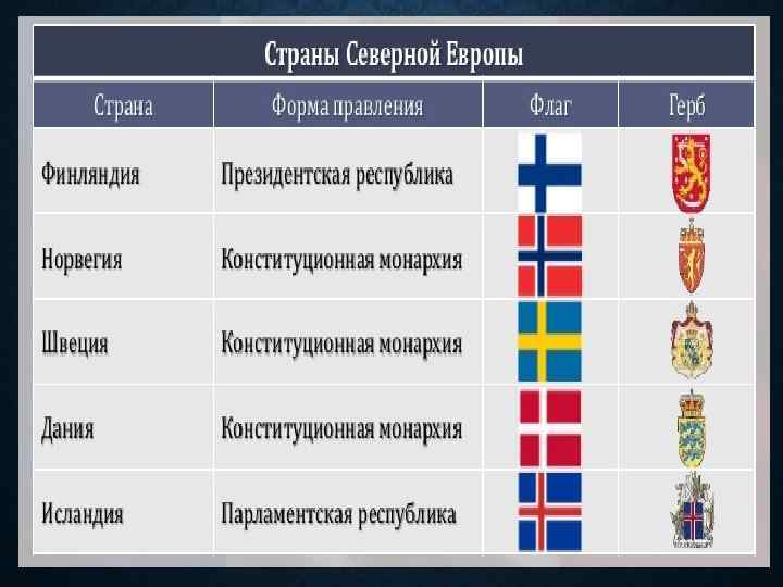 1. Назовите и покажите страны Северной Европы. 2. Назовите столицы государств. 3. Дайте краткую характеристику географического положения. 1. Какова форма правления государств Северной Европы? 2. Что является символами успеха этих стран?