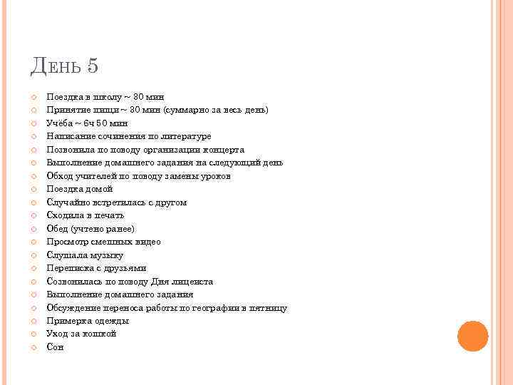 ДЕНЬ 5 Поездка в школу ~ 30 мин Принятие пищи ~ 30 мин (суммарно за весь день) Учёба ~ 6 ч 50 мин Написание сочинения по литературе Позвонила по поводу организации концерта Выполнение домашнего задания на следующий день Обход учителей по поводу замены уроков Поездка домой Случайно встретилась с другом Сходила в печать Обед (учтено ранее) Просмотр смешных видео Слушала музыку Переписка с друзьями Созвонилась по поводу Дня лицеиста Выполнение домашнего задания Обсуждение переноса работы по географии в пятницу Примерка одежды Уход за кошкой Сон