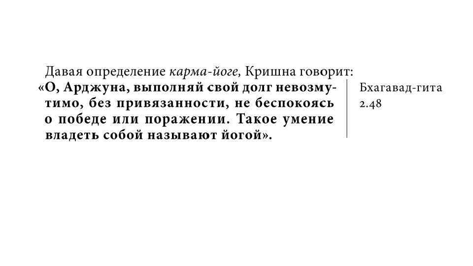 В «Бхагавад-гите» перечисляются основные виды йоги – разные пути духовного совершенствования: - Карма-йога – наука о правильной деятельности, о том, как - связать свою деятельность с Богом. Гьяна-йога – путь философского поиска истины, отречения от мира, наука о том, как понять Бога. Аштанга-йога – путь контроля ума и мистического поиска истины в медитации, учащий, как постичь свое духовное «я» и увидеть Бога в своем сердце. Бхакти-йога – полное раскрытие потенциала души, развитие любви к Богу и служение Ему и людям.