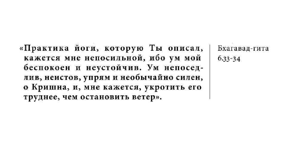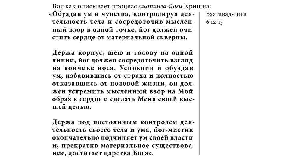 Закончить разбор этой темы можно цитатой из «Йога-сутр» (1. 23), где говорится, что все то, что практикующий пытается достичь, следуя путем этой йоги, можно получить, просто предавшись Богу – то есть идя путем бхактийоги, о которой мы будем говорить на следующем занятии.