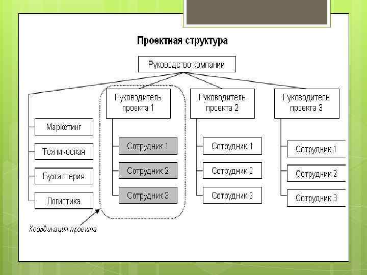 Проектная структура управления Основным принципом построения проектной структуры является концепция проекта, под которым понимается любое целенаправленное изменение в системе, например, освоение и производство нового изделия, внедрение новых технологий, строительство объектов и т. д. Деятельность предприятия рассматривается как совокупность выполняемых проектов, каждый из которых имеет фиксированное начало и окончание. Под каждый проект выделяются трудовые, финансовые, промышленные и т. д. ресурсы, которыми распоряжается руководитель проекта. Каждый проект имеет свою структуру, и управление проектом включает определение его целей, формирование структуры, планирование и организацию работ, координацию действий исполнителей. После выполнения проекта структура проекта распадается, ее компоненты, включая сотрудников, переходят в новый проект или увольняются (если они работали на контрактной основе).