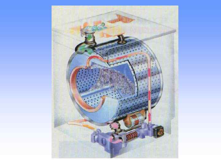 МАШИНЫ БАРАБАННОГО ТИПА Стиральные машины барабанного типа – по сути это бак, к которому подключены системы подачи и слива воды. В нём вращается барабан, испещрённый множеством отверстий и перфорированными рёбрами внутри. В барабан загружают бельё и частично заполняют водой (рис. 1). Он вращается, при этом бельё подхватывается рёбрами, поднимается вверх и падает в воду (процесс напоминает отбивание о воду). Помимо того, перфорированные рёбра зачерпывают воду снизу барабана и, повернувшись, выливают её сверху на бельё (система «дождь» ). В более дорогих моделях применяется система спрыска. При посредстве специального насоса вода бьёт сильной струёй в бельё, распластанное на стенках барабана. Таким образом вода дополнительно прокачивается через ткань, то есть бельё проходит своеобразный «душ Шарко» . Система спрыска у разных производителей называется по разному: «Актива» - Candy, «Джет» - Zanussi, «Душ» - Electrolux, «Гейзер» - Sangiorgio и т. д.