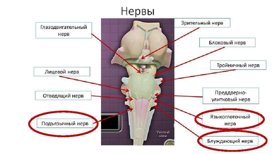 Черепно-мозговые нервы продолговатого мозга Номер и название пары черепномозговых нервов Ядра Область иннервации Моторные Сенсорные Вегетативные XII пара, Подъязычный Ядра подъязычного нерва - - Мышцы языка XI пара, Добавочный Спинно-мозговое ядро - - Мышцы шеи (Трапециевидная, грудиноключичнососцевидная) X пара, Блуждающий Двойное ядро Ядро одиночного пути Дорсальное (заднее) ядро блуждающего нерва Иннервирует внутренние органы, гортань, мышцы глотки тд IX пара, Языкоглоточный Двойное ядро Ядро одиночного пути Нижнее слюноотделительное ядро Слизистые оболочки рта и носа, слюнные железы