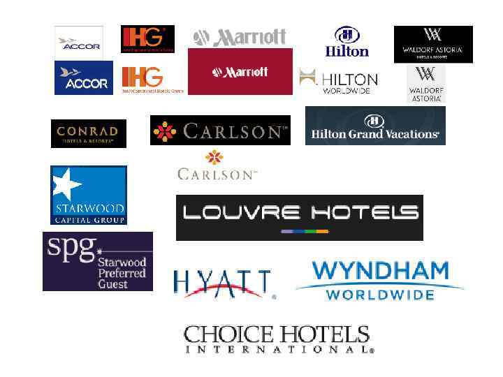 The bigest hotel chaines 1. 2. 3. 4. 5. 6. 7. 8. 9. 10. 11. 12. 13. 14. 15. 16. 17. 18. 19. 20. IHG (Inter. Continental Hotels Group) 585, 094 3, 949 1 Windsor, England 556, 246 3, 741 2 Wyndham Hotel Group 550, 576 6, 544 2 Parsippany, N. J. USA 543, 234 6, 473 3 Marriott International 537, 249 2, 999 3 Washington, D. C. USA 513, 832 2, 832 4 Hilton Hotels Corp. 502, 116 3, 000 4 Beverly Hills, Calif. USA 501, 478 2, 935 5 Accor 461, 698 3, 871 5 Paris, France 486, 512 4, 121 6 Choice Hotels International 452, 027 5, 570 6 Silver Spring, Md. USA 435, 000 5, 376 7 Best Western International 308, 636 4, 035 7 Phoenix, Ariz. USA 315, 401 4, 164 8 Starwood Hotels & Resorts Worldwide 274, 535 897 8 White Plains, N. Y. USA 265, 600 871 9 Carlson Hotels Worldwide 146, 600 969 9 Minneapolis, Minn. USA 145, 331 945 10 Global Hyatt Corp. 135, 001 721 10 Chicago, Ill. USA 1