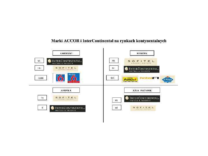 ACCOR & IHG Hotels in 2010 1 Am Pn ACCOR IHG 1107 112644 187 28634 1+2 Ameryki 1294 141278 3 Europa 2356 257748 147 24637 2505 282385 430 83643 4226 507306 2 Am Łacińska 4 Afryka i Bliski Wschód 3+4 5 Azja i Pacyfik Ogółem 3514 440447 664 118409 289 86098 4465 644801