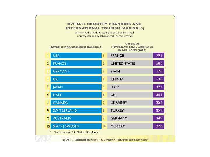 National Brand Index S. Anholt • 20 000 enquieries in 20 countries. • Each respondent enswers 40 questions. • Questions are connected with 50 diferent countries.