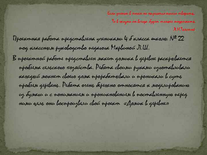 Если ученик в школе не научится ничего творить, То в жизни он всегда будет только подрожать. Л. Н. Толстой. Проектная работа представлена учениками 4 б класса школы № 22 под классным руководство педагога Марвиной Л. Ш. В проектной работе представлен макет домика в деревне раскрывается проблема сельского хозяйства. Ребята своими руками изготавливали каждый мокнет своего дома прорабатывали и проникали в суть проблем деревень. Ребята очень бережно относятся к моделированию из бумаги и с пониманием и проникновением в поставленную перед ними цель они воспроизвели свой проект «Домик в деревне»