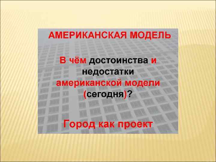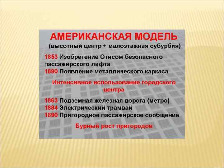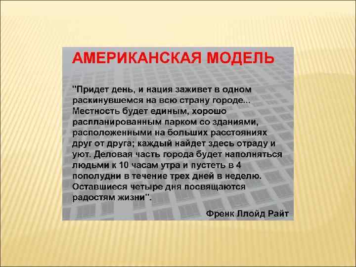 (плотная высотная деловая застройка центра и 1 - 2 -этажная жилая субурбия). Начала реализовываться в Чикаго и других быстро растущих промышленных городах США после 1890 г.
