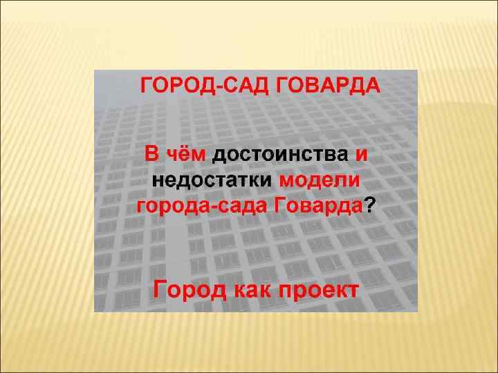 ОСНОВНЫЕ ПРИНЦИПЫ КОНЦЕПЦИИ Э. ГОВАРДА функциональное зонирование городских территорий (на промышленные зоны, жилую застройку, включая школы, общественный центр, территории отдыха) - принцип, требующий строгого соблюдения принцип иерархического строения города. «Новаторством было понимание большого города как системы элементов, наделенных определенными функциями, и входящих, в свою очередь, в состав более крупных структурных единиц» связь между местом жительства и местом работы , значимость которой для повседневной жизни людей была показана Говардом, стала одним из существенных принципов градостроительства ХХ века Схема "правильного" развития городасада Э. Говарда. Формируются аналогичные образования, разделенные территориями сельскохозяйственного назначения и соединенные трассами скоростного транспорта озеленение свободного пространства территории города