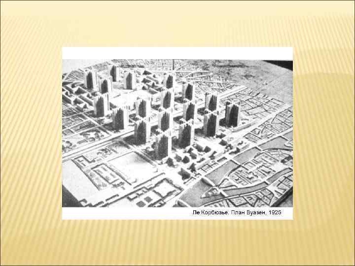 «Современный город» Ле Корбюзье 1922. Город, рассчитанный на 3 млн. чел. состоял из 24 -х 60 -этажных административных зданий в центре и 10 -ти 12 -этажных жилых домов, составленных из стандартных «жилых ячеек» . В 1925 г. он предложил проект реконструкции Парижа, наложив схему «Современного города» на исторический центр города – «План Вуазьен» .
