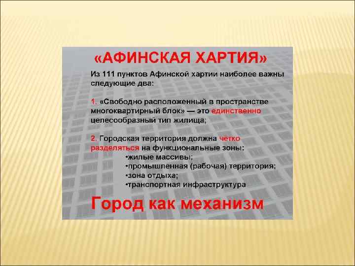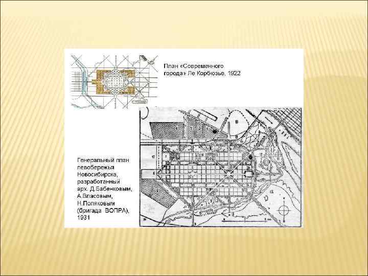 ОСНОВНЫЕ ПРИНЦИПЫ ГРАДОСТРОИТЕЛЬНОЙ КОНЦЕПЦИИ ЛЕ КОРБЮЗЬЕ высотная застройка (60 -ти этажные небоскребы) дает возможность озеленить территорию города первый этаж зданий остается без заполнения территория города - большая прогулочная зона для пешеходов, тем более что одни транспортные пути спрятаны под землю, а другие подняты над нею. Ле Корбюзье и П. Жаннере. Современный город, 1922 г. План и вид центрального района с севера. Центр города образуют 24 60 -этажных небоскреба, имеющих в плане крестообразную форму со сторонами длиной 175 м. В каждом здании должно размещаться от 10 до 50 тыс. рабочих мест. Небоскребы расположены на значительном расстоянии один от другого, но благодаря их огромному объему плотность населения составляет 3000 чел. /га. Территория между небоскребами росит характер парка, в котором расположены широкие автомобильные магистрали, находятся стоянки, гаражи, а также многочисленные невысокие здания, где размещаются магазины, рестораны, учреждения культуры и т. д. К западу от административного центра расположены важнейшие общественные здания. Эту часть города окружает многоэтажная жилая застройка с «зубчатыми» зданиями и «висячими садами» ; плотность населения около 300 чел. /га. Полоса лесов и сельскохозяйственных земель шириной в несколько километров, представляющая собой резерв для дальнейшего развития города, отделяет города-сады от центрального района. К востоку от административного центра находится промышленный район.