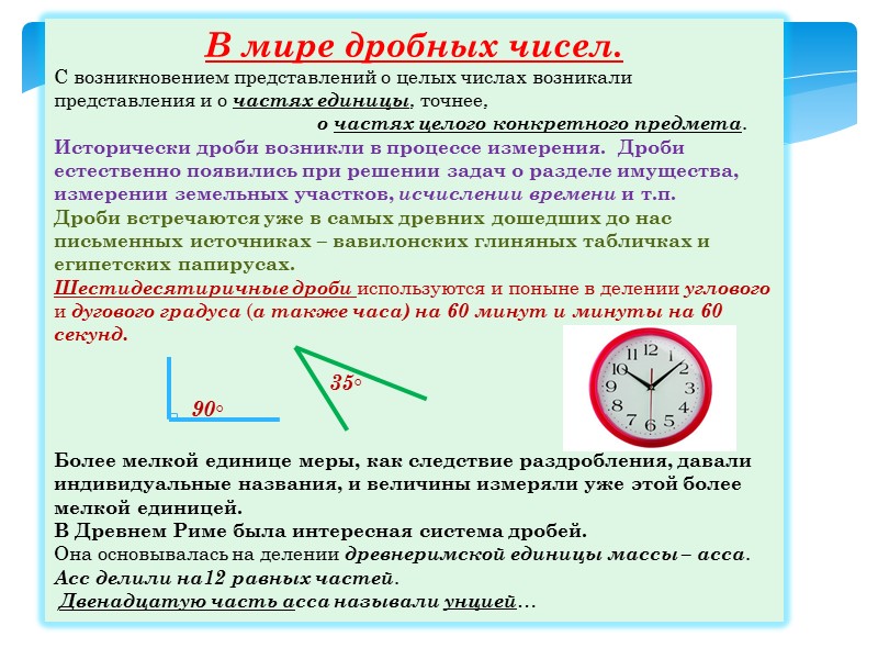 В мире дробных чисел. С возникновением представлений о целых числах возникали представления и о частях единицы, точнее, о частях целого конкретного предмета. Исторически дроби возникли в процессе измерения. Дроби естественно появились при решении задач о разделе имущества, измерении земельных участков, исчислении времени и т.п. Дроби встречаются уже в самых древних дошедших до нас письменных источниках – вавилонских глиняных табличках и египетских папирусах. Шестидесятиричные дроби используются и поныне в делении углового и дугового градуса (а также часа) на 60 минут и минуты на 60 секунд. 35◦ 90◦ Более мелкой единице меры, как следствие раздробления, давали индивидуальные названия, и величины измеряли уже этой более мелкой единицей. В Древнем Риме была интересная система дробей. Она основывалась на делении древнеримской единицы массы – асса. Асс делили на12 равных частей. Двенадцатую часть асса называли унцией…