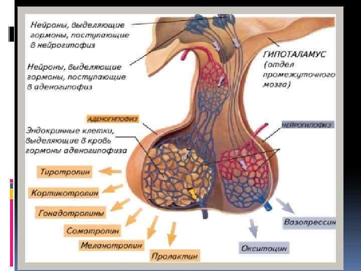 Нейрогипофиз - задняя доля гиофиза, выделяет в кровь гормоны, которые вырабатываются в гипоталамусе – части промежуточного мозга, состоящей из ядер серого вещества и белого вещества. Отростки нейронов гипоталамуса проникают в заднюю долю гипофиза. Эти отростки транспортируют гормоны из гипоталамуса в гипофиз. Основными нервные тракты, которые идут в гипофиз возникают из относительно большоих одноклеточных парных ядер - супраоптического (ядро находится выше зрительного тракта) , а паравентрикулярного ядра , расположенного на каждой стороне третьего желудочка.